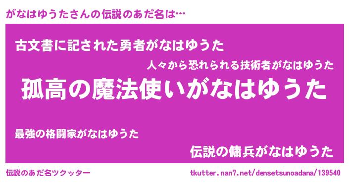 | 胡散臭い通販商品みたいなあだ名 | 『信頼と実績のサプリメント…その名も「がなはゆうた」』 |