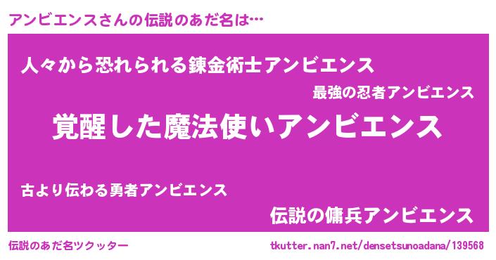 | 男性向けラノベタイトル風あだ名 | 『アンビエンスの嫁は女の子じゃないと思った?』 |