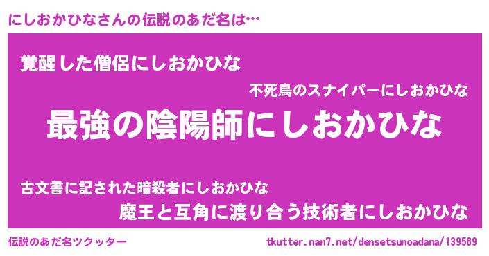 | 男性向けラノベタイトル風あだ名 | 『にしおかひな~年齢イコール彼女いない歴の魔法使い~』 |