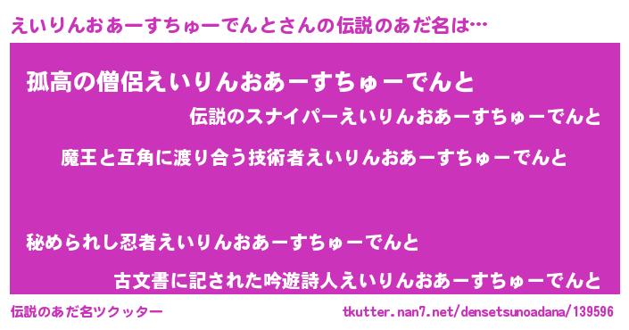 | 男性向けラノベタイトル風あだ名 | 『おまえをオタクにしてやるから、俺をえいりんおあーすちゅーでんとにしてくれ! 』 |