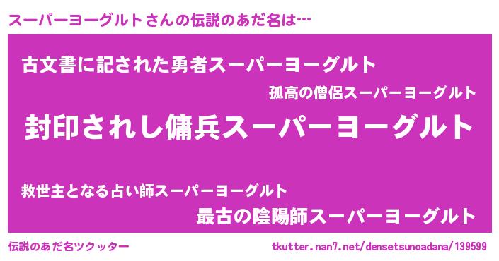 | 女子向けラノベタイトル風あだ名 | 『スーパーヨーグルトの玉の輿計画!』 |