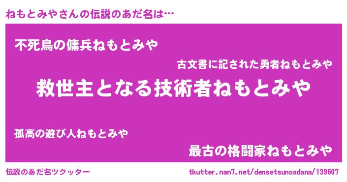 | ヒーロー風カッコイイあだ名 | 『慈愛の使者ねもとみや』『天弓騎士ネモ』 |