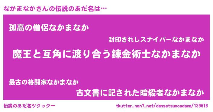 | 女子向けラノベタイトル風あだ名 | 『闇のなかまなか』『なかまなか恋絵巻』 |