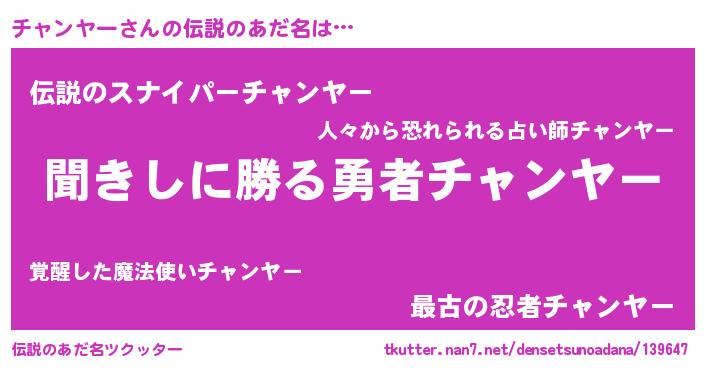 | 男性向けラノベタイトル風あだ名 | 『チャンヤースレイヤー』 |