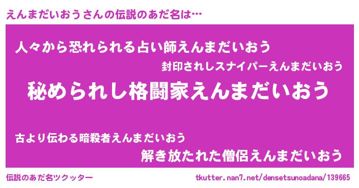 | 意味不明あだ名 | 『住所不定無職えんまだいおう(8歳)』 |
