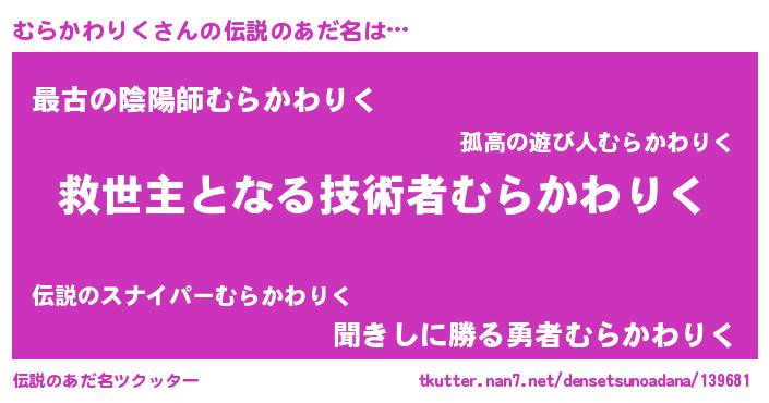 | ヒーロー風カッコイイあだ名 | 『究極戦士ムラカワリク』『仮面ムラダー』 |