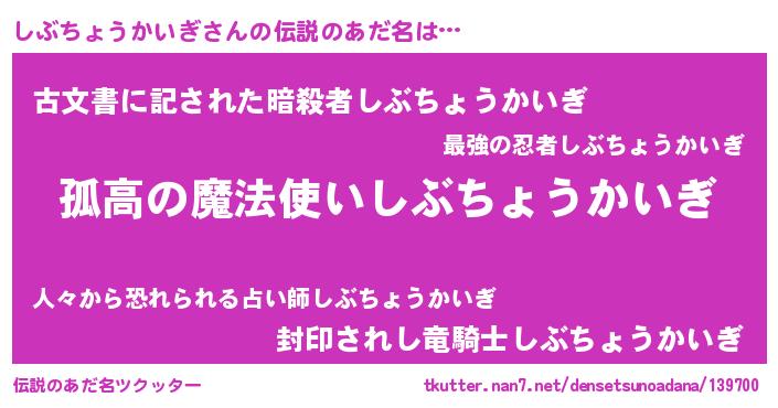 | ヒーロー風カッコイイあだ名 | 『仮面シブダー』『炎刃騎士シブ』 |