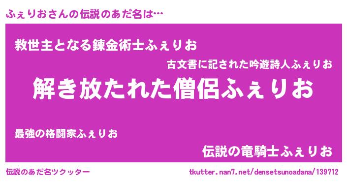 | 意味不明あだ名 | 『たけのこ科ふぇりお属』『自称ふぇりお』 |