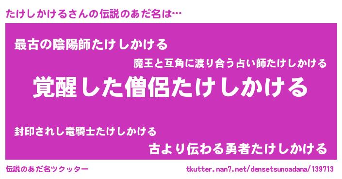 | 男性向けラノベタイトル風あだ名 | 『Re:たけしかけるから始める異世界生活』 |