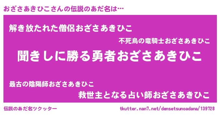 | 女子向けラノベタイトル風あだ名 | 『異世界で失敗しない100のおざさあきひこ』 |