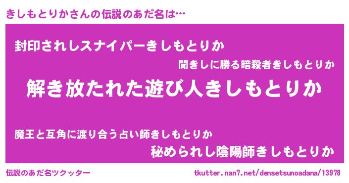 | 意味不明あだ名 | 『とにかく怪しいきしもとりか』 |