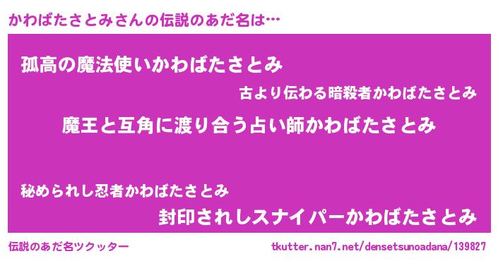 | ヒーロー風カッコイイあだ名 | 『慈愛の使者かわばたさとみ』 |