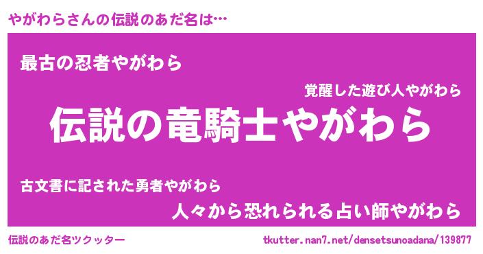 | ヒーロー風カッコイイあだ名 | 『スーパーヤガワラ』『銀牙騎士ヤガ』 |