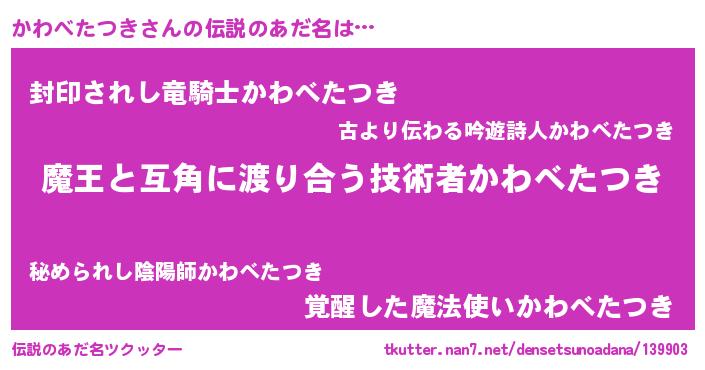 | 意味不明あだ名 | 『自称かわべたつき』 |