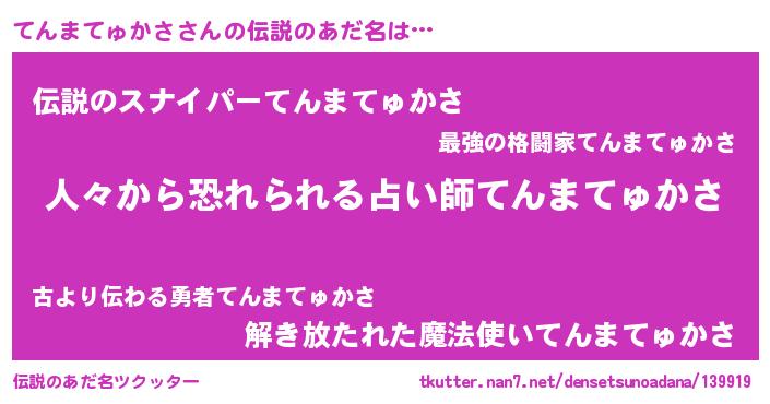 | 男性向けラノベタイトル風あだ名 | 『おまえをオタクにしてやるから、俺をてんまてゅかさにしてくれ! 』 |