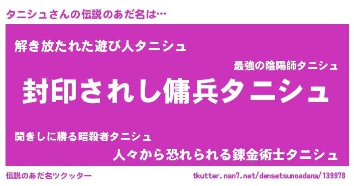 | ヒーロー風カッコイイあだ名 | 『スーパータニシュ』『天弓騎士タニ』 |