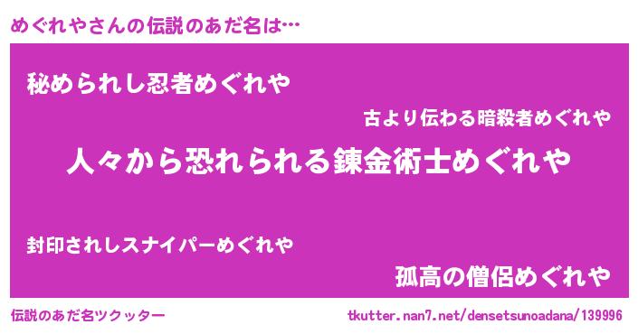 | ヒーロー風カッコイイあだ名 | 『友情の使者めぐれや』『仮面メグダー』 |