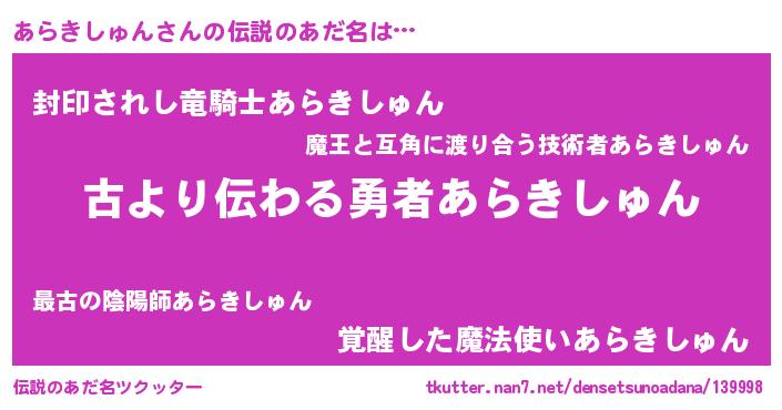 | ヒーロー風カッコイイあだ名 | 『ネオアラキシュン』『炎刃騎士アラ』 |