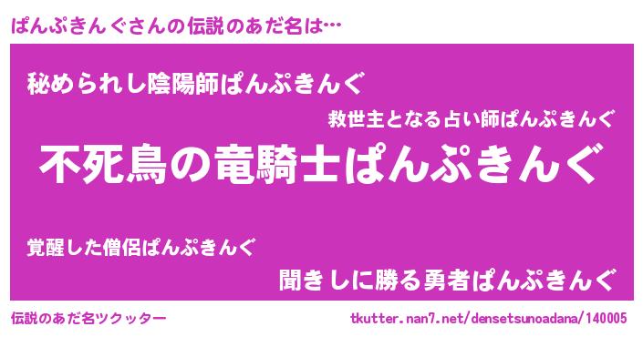 | 男性向けラノベタイトル風あだ名 | 『魔弾の王とぱんぷきんぐ』 |