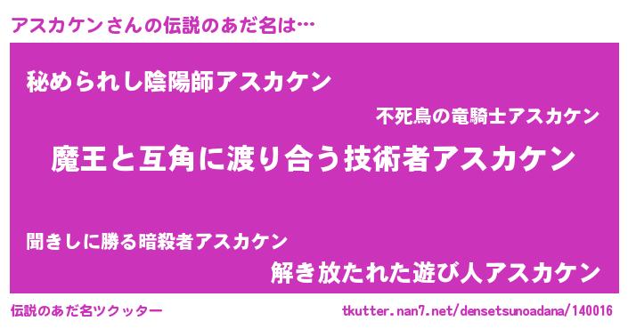 | 肩書あだ名 | 『アスカケン助教授』『アスカケン中将』 |