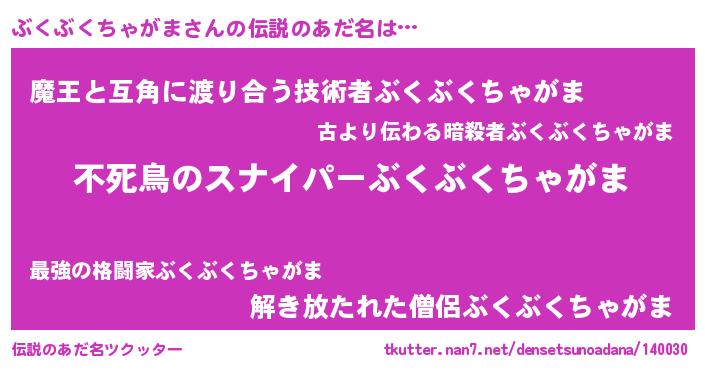 | 男性向けラノベタイトル風あだ名 | 『転生したらぶくぶくちゃがまだった件』 |