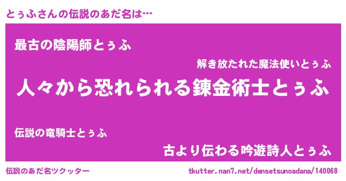 | 男性向けラノベタイトル風あだ名 | 『おまえをオタクにしてやるから、俺をとぅふにしてくれ! 』 |