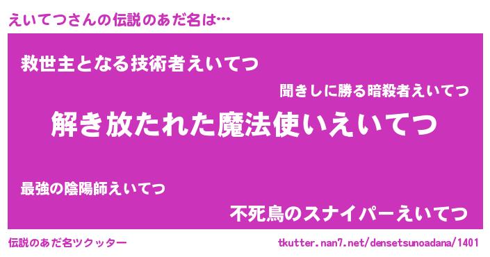 | 男性向けラノベタイトル風あだ名 | 『転生したらえいてつだった件』 |