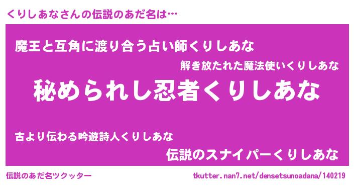 | 女子向けラノベタイトル風あだ名 | 『くりしあなの雑貨屋さん』 |