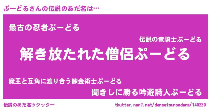 | 男性向けラノベタイトル風あだ名 | 『ダンジョンにぷーどるを求めるのは間違っているだろうか』 |