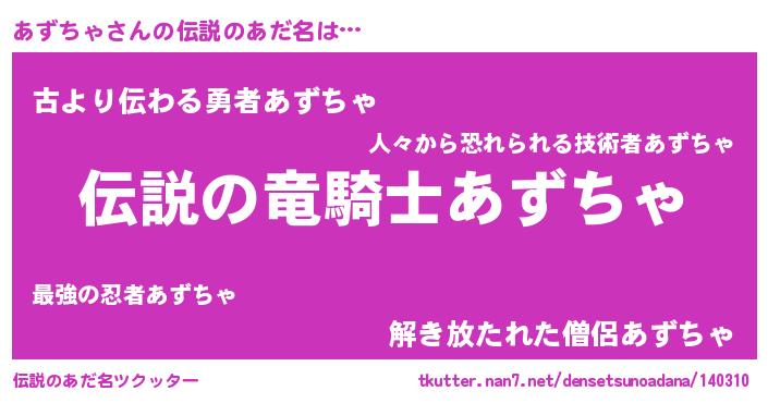 | 男性向けラノベタイトル風あだ名 | 『あずちゃの憂鬱』『緋弾のアズチャ』 |