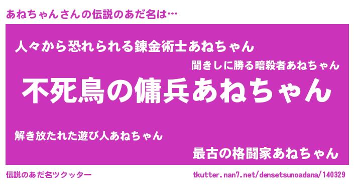 | 女子向けラノベタイトル風あだ名 | 『あねちゃん姫と円卓の騎士』 |