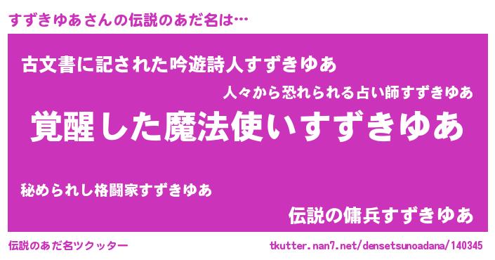 | 男性向けラノベタイトル風あだ名 | 『すずきゆあの嫁は女の子じゃないと思った?』 |