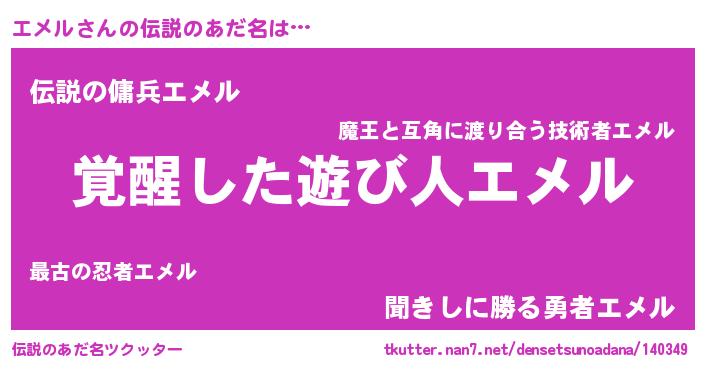 | ヒーロー風カッコイイあだ名 | 『炎刃騎士エメ』『スーパーエメル』 |