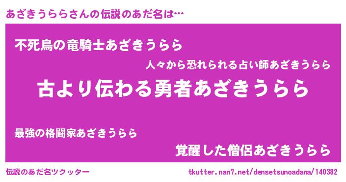 | 胡散臭い通販商品みたいなあだ名 | 『来世でも幸せになれる水素水…その名も「あざきうらら」』 |