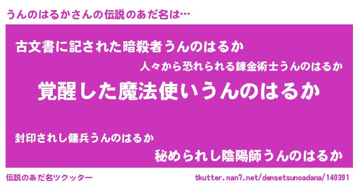 | 男性向けラノベタイトル風あだ名 | 『うんのはるかの嫁は女の子じゃないと思った?』 |