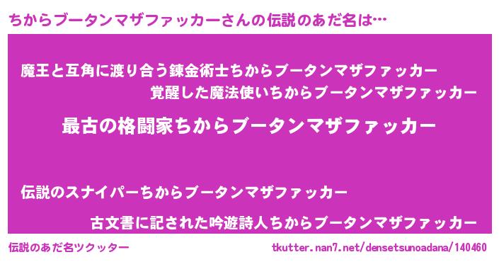 | 意味不明あだ名 | 『住所不定無職ちからブータンマザファッカー(4歳)』 |