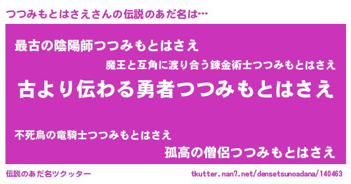 | 意味不明あだ名 | 『住所不定無職つつみもとはさえ(85歳)』 |