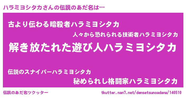 | ヒーロー風カッコイイあだ名 | 『魔戒騎士ハラ』『ネオハラミヨシタカ』 |