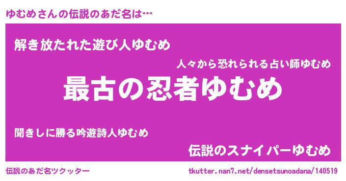 | 意味不明あだ名 | 『ゆむめフォーエバー』『自称ゆむめ』 |