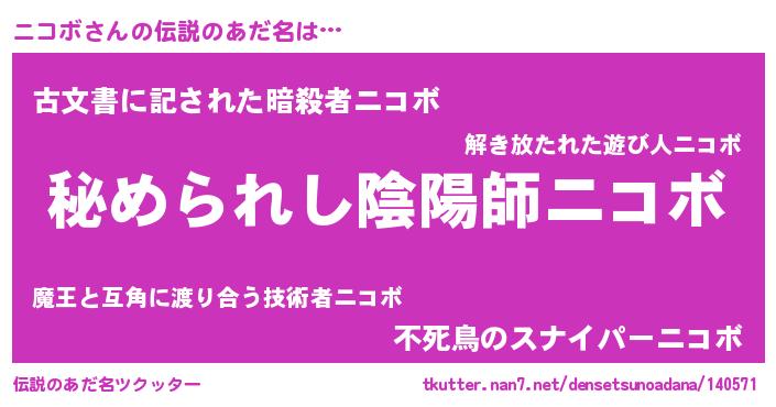| 男性向けラノベタイトル風あだ名 | 『ニコボスレイヤー』 |