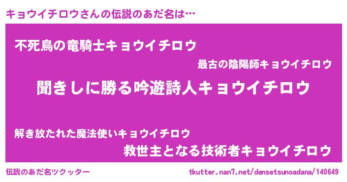| 男性向けラノベタイトル風あだ名 | 『キョウイチロウという概念が存在しない退屈な世界 』 |