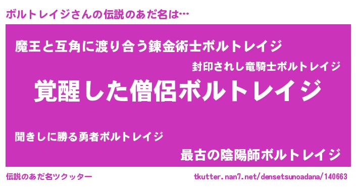 | 男性向けラノベタイトル風あだ名 | 『ボルトレイジの嫁は女の子じゃないと思った?』 |
