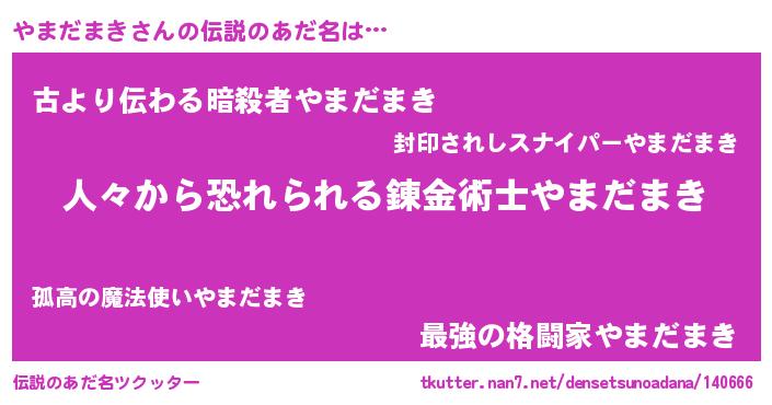 | 男性向けラノベタイトル風あだ名 | 『おまえをオタクにしてやるから、俺をやまだまきにしてくれ! 』 |