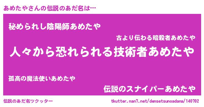 | ヒーロー風カッコイイあだ名 | 『友情の使者あめたや』『仮面アメダー』 |
