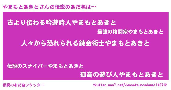 | 男性向けラノベタイトル風あだ名 | 『ヤマモトアキトスレイヤー』 |