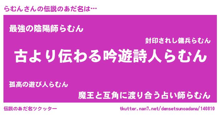 | 男性向けラノベタイトル風あだ名 | 『らむんという概念が存在しない退屈な世界 』 |