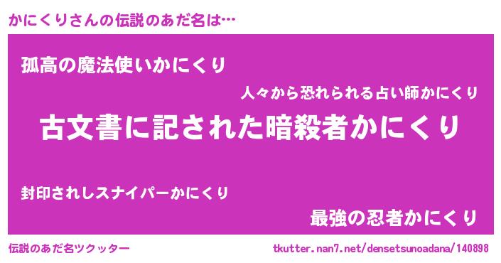| 男性向けラノベタイトル風あだ名 | 『Re:かにくりから始める異世界生活』 |
