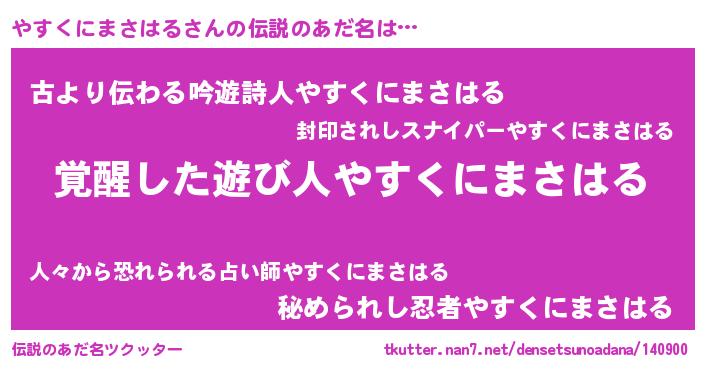 | 男性向けラノベタイトル風あだ名 | 『やすくにまさはる~年齢イコール彼女いない歴の魔法使い~』 |