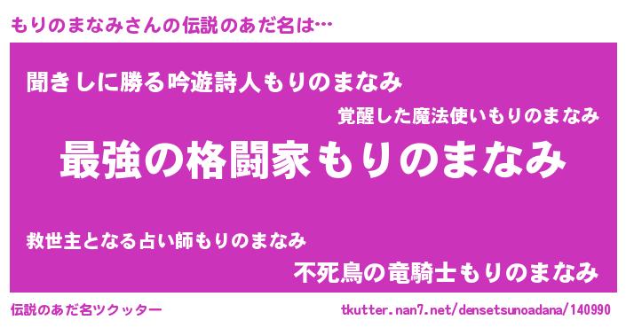 | 男性向けラノベタイトル風あだ名 | 『うちの娘の為ならば、俺はもしかしたらもりのまなみも倒せるかもしれない。』 |