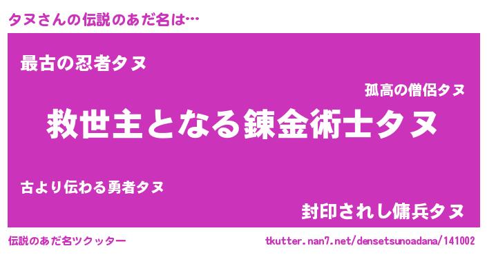 | 男性向けラノベタイトル風あだ名 | 『タヌに滅ぼされるだけの簡単なお仕事です』 |
